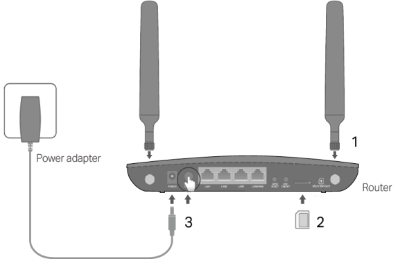 Connectez l'adaptateur secteur et appuyez sur le bouton POWER ON/OFF pour allumer le routeur. La source d'alimentation doit être à proximité de l'appareil et doit être facilement accessible.